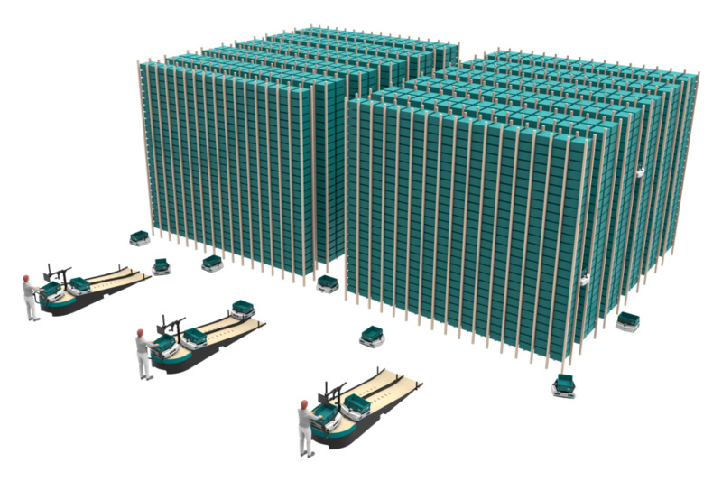 Skypod是仓储系统的运输员,可以负载30kg的重量,除了可以在地面移动,还可以攀爬货架,并从其中的某一层中取出货物搬运。Skypod将取到的货物运送到固定站点,工作人员取走货物,Skypod返回继续搬运。货架中的货物存放在高度20~30cm的标准盒子中,货架高度可到10米。