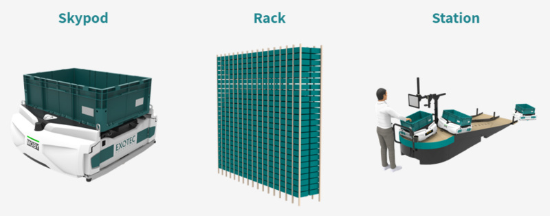 Exotec致力于通过三维移动机器人和配套设施,为电商和零售行业打造全自动化的仓储系统。整个系统由三个主要模块组成:仓储机器人Skypod、货架、站点。