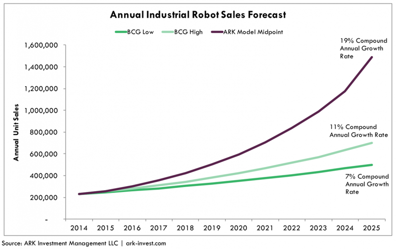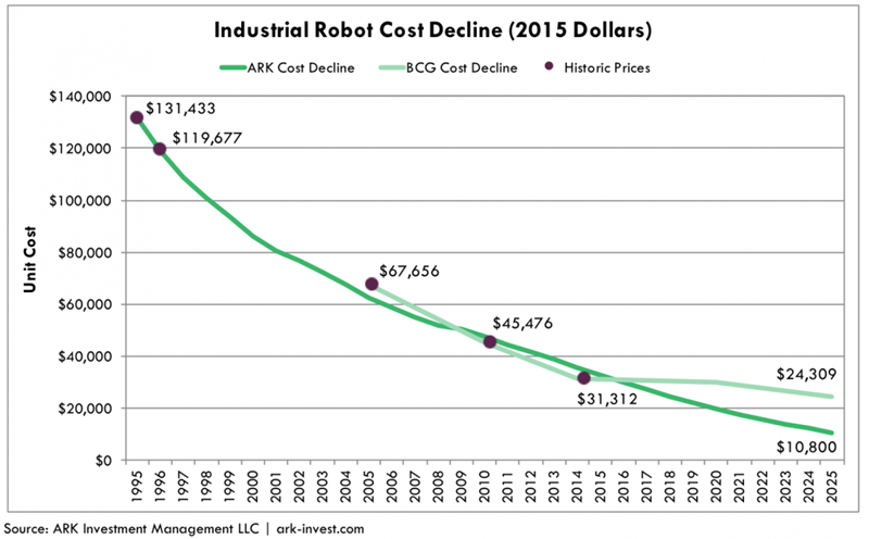 对于工业机器人成本下降趋势,多家机构都给出了自己的预测,其中ARK投资管理公司的预测最为激进。