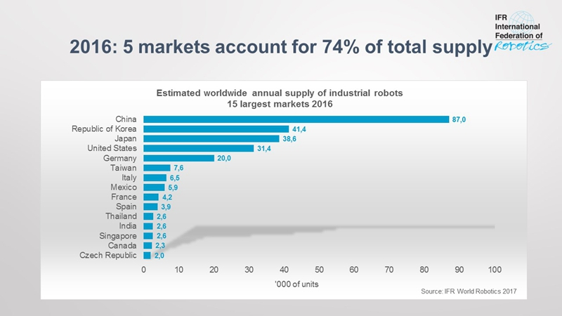 目前,中国、韩国、日本、美国和德国是全球工业机器人前五大市场,占据着2016年工业机器人销售的74%。