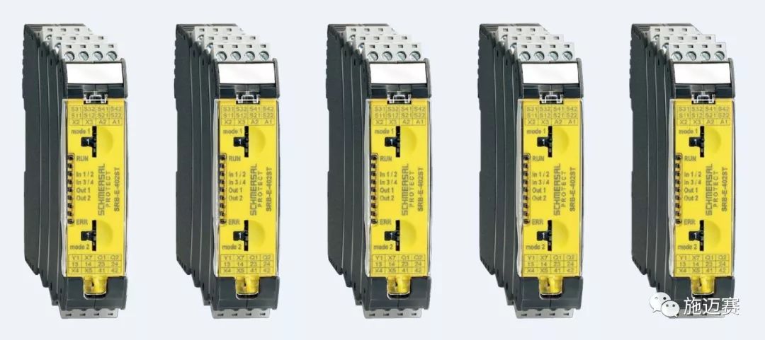 机器人工作站保卫工作单靠开关类产品 ,是无法满足EN ISO 13849-1控制等级要求的,需要监控模块对开关信号监控,这些信号可以是来自滑动门、铰链门和活动门上的机械位置开关、安全开关、安全电磁锁或安全磁开关等。根据外部电路的设计安排,保护系统可以达到EN ISO 13849-1安全控制等级4。SRB 系列防护门监控器采用传统继电器技术。模块内部采用冗余电路设计,配备多路肯定断开式触点,继电器触点串联形成安全输出通道。所有满足EN ISO 13849-1控制等级3的防护门监控器配备了双处理器和不同的编程。这些监控器集成有系统诊断功能(ISD),这大大节省了客户时间和维修费用。