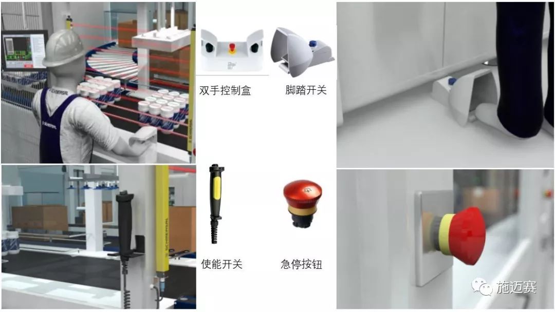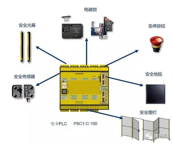 当机器人工作站和周边设备安全的信号比较多时,例如安全光幕,安全电磁锁,安全门开关,急停按钮,安全地毯等,施迈赛Schmersal推荐使用安全PSC1系列产品来处理安全信号,这样更加方便和经济。PSC1系列模块内部采用冗余电路设计,输入输出通道均采用双通道冗余结构。可编程安全PSC1系列根据《机械指令2006/42/EC》附录IV,进行安全的逻辑测试控制,安全PLC各模块通过安全认证,多种的通讯方式,所有常规的安全开关柜连接到PSC1中可以达到EN-ISO 13849-1的安全等级PLe。