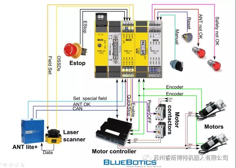 首先,在双轮差速AGV系统设计的过程中,最容易忽视的是通过接触器通断驱动系统的供电,一般需要在两个电机的供电回路上各增加一个接触器,并且两个接触器串联到供电回路中,组成双保险。有兴趣的也可以看看下面瑞士Bluebotics系统建议的安全配置方案。