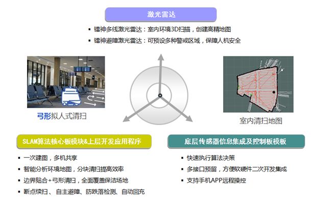保洁机器人以先进的多传感器融合和SLAM技术赋予机器人工智能,使其实现无人状态下高度自动化的清洁作业。镭神智能针对室内清洁作业场景,为清洁机器人打造一个集精确定位建图、“弓形”拟人式清扫路径规划、主动避障及控制运行为一体的智能环境感知系统。