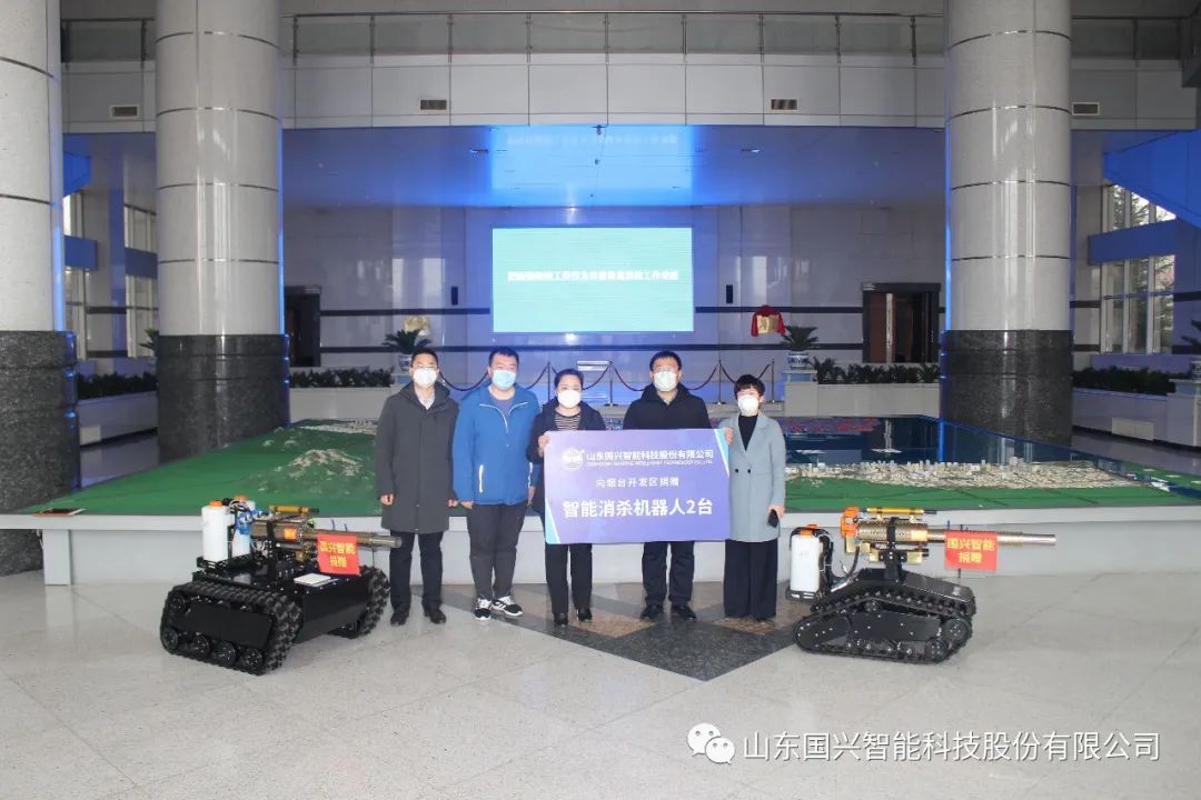 山东国兴智能科技股份有限公司是山东省的瞪羚企业,一直专注于特种机器人的研发、生产、销售。作为行业领军企业,秉承科技服务人类的理念,自疫情爆发就积极加入到了这场防疫大战之中。疫情爆发后,为助力疫情防控,保护一线防疫人员的安全,公司发动全部科研力量,凭借在特种机器人智能控制底盘领域的研发优势,争分夺秒的研制出了智能消杀战疫机器人“雷神”和“火神”。为了支援防疫工作,国兴智能承担其社会责任,捐赠2台消杀机器人给烟台开发区管委用于在辖区内开展消杀工作,并捐赠1台消杀机器人给武汉战区医院用于院区消杀工作,努力让机器人到最需要的地方贡献力量。