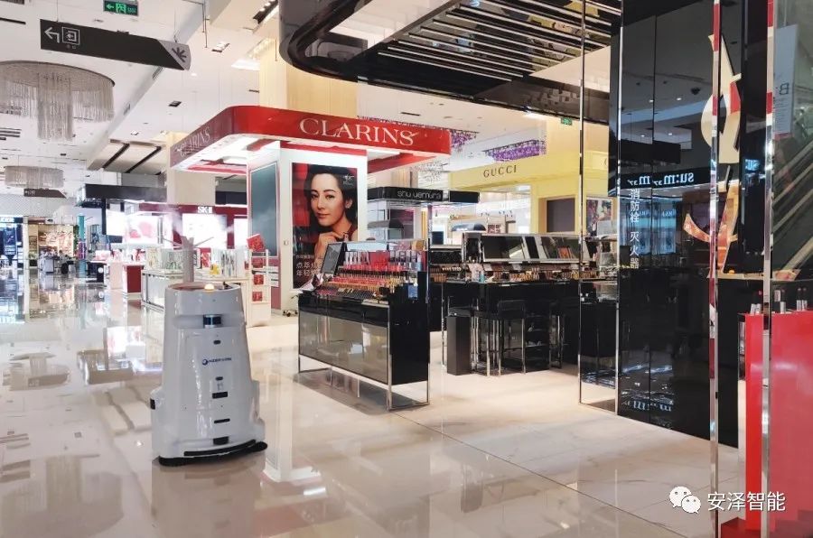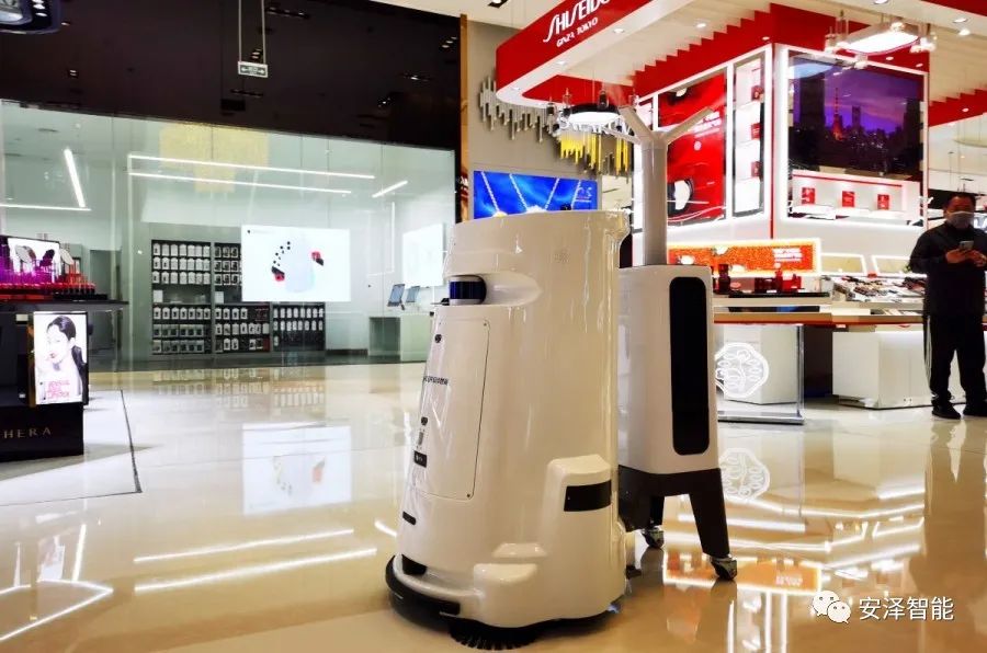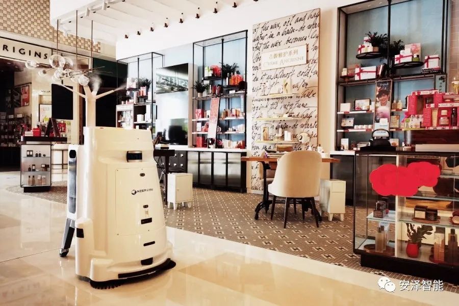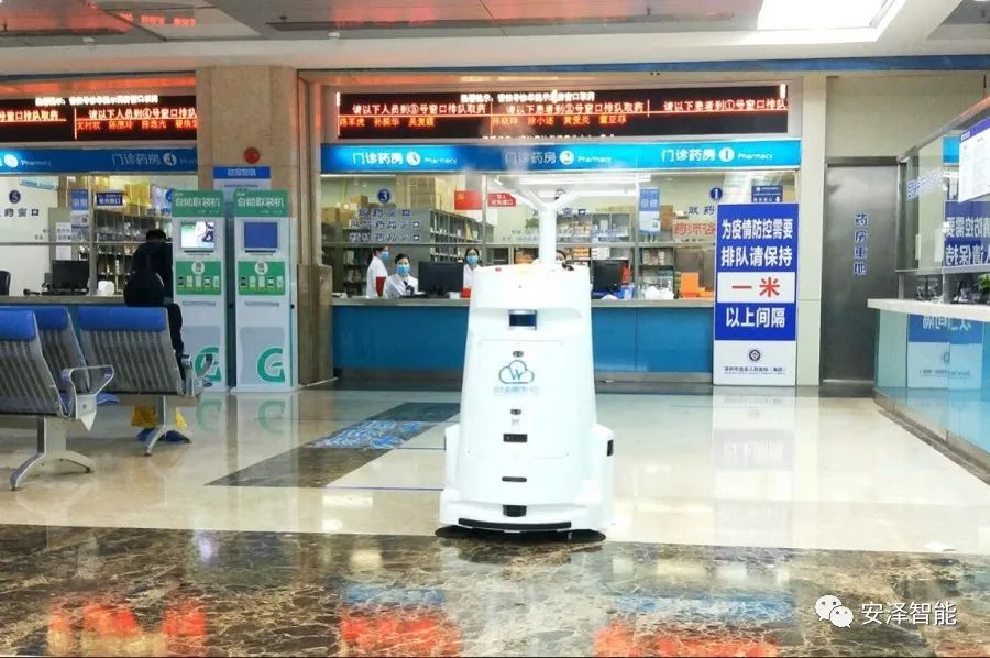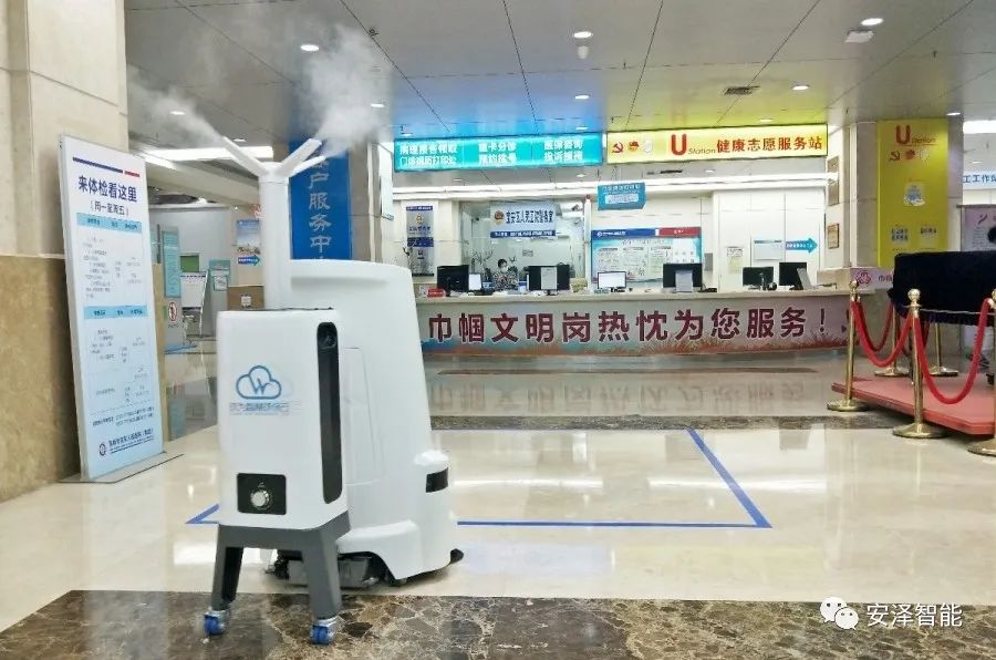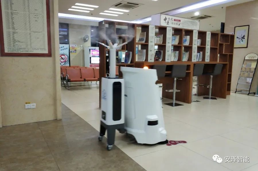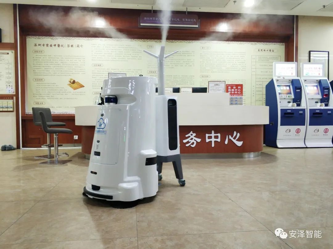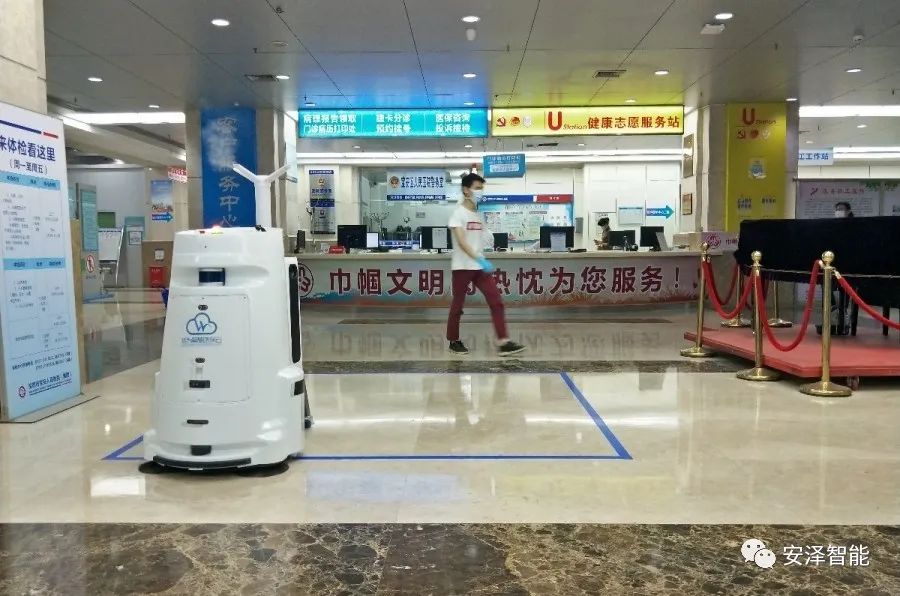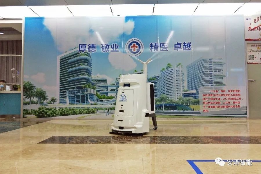 疫情防控期间,安泽智能推出的消毒清洁机器人纷纷在宝安中医院、宝安人民医院、成都群光广场等场所上岗,在进行清洁工作的同时,对环境物表和空气进行移动式杀菌消毒,保障公共场所环境清洁,阻断病毒传播。