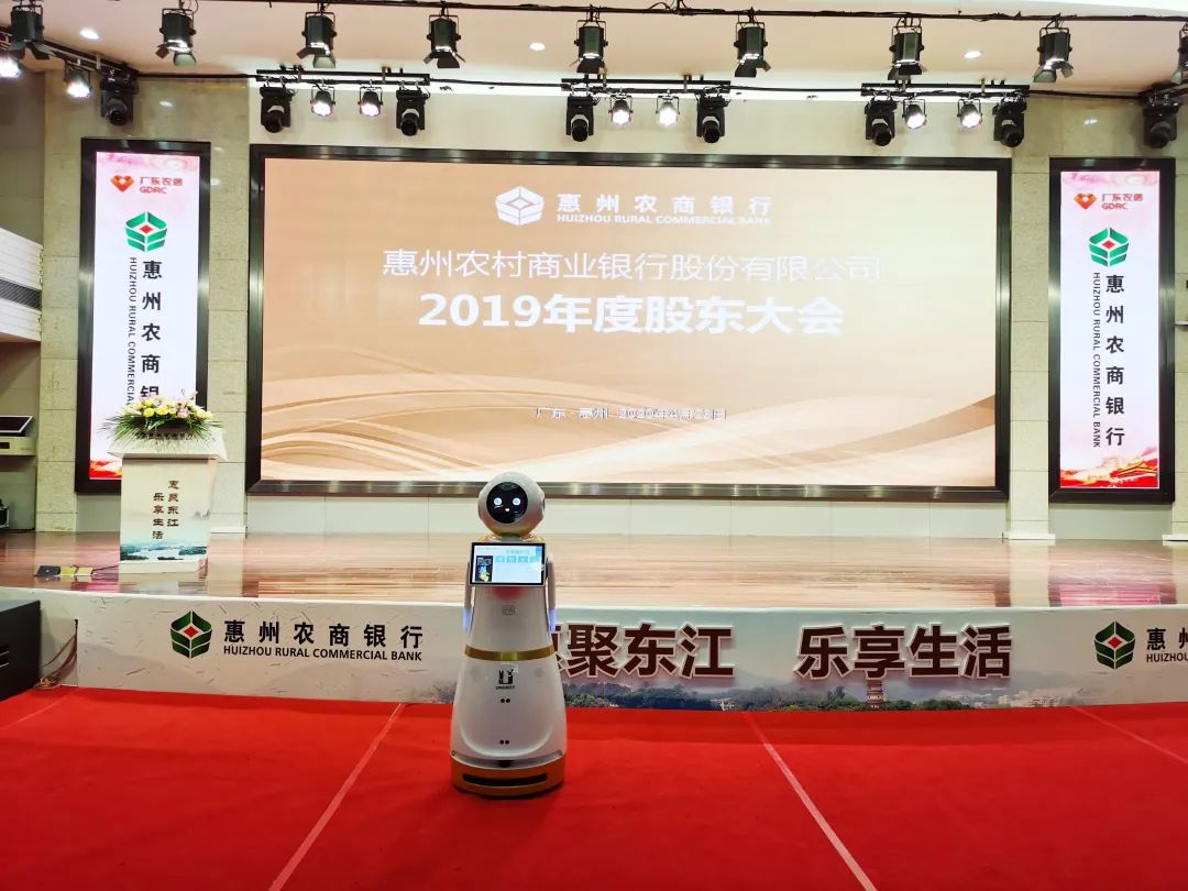 惠州农村商业银行股份有限公司2019年度股东大会在惠州举办,机器人现场提供迎宾接待、引导带路等服务。