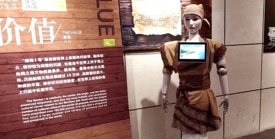站在二楼展厅为游客们提供讲解服务的,是当天正式投入使用的机器人“小澳”。机器人小澳拥有女性化的外形,身着宋代船员的服饰,胸口上安装着电子显示屏。它不仅可以在博物馆内来回巡视,还可以通过语音识别、触摸交互、移动互联等方式,为游客提供智能化、人性化的咨询、引导和讲解等服务。