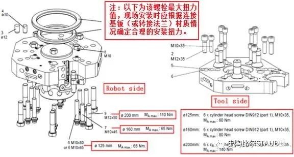 工具侧换枪盘分度圆φ125和φ160安装扭力:线体商需配合工具侧基座材质进行扭力值确认,若为史陶比尔换枪盘转接法兰盘,我们建议的扭力值为MA max:80N.m。