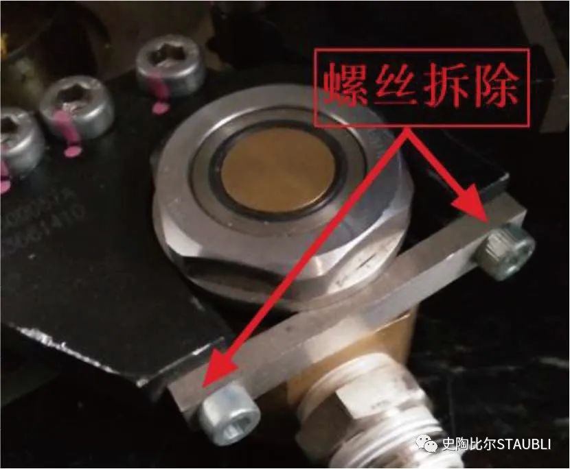 1. 拆除安装在水接头固定板上的螺栓和挡条,取下接头: