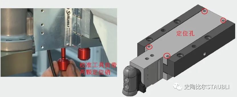 其次,通过校准工具自带的两颗定位销将停靠站浮动机构进行定位。