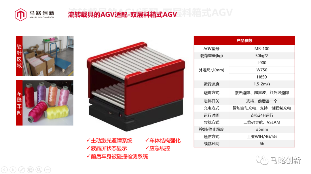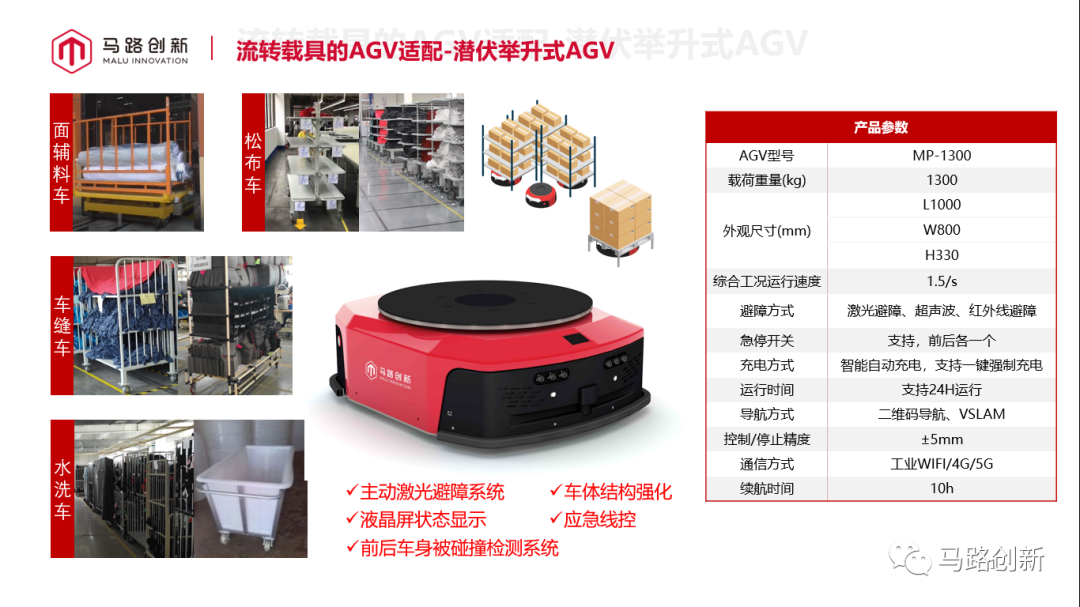 比如1.5吨的面辅料车,双边8层500-600kg的松布车,以及500kg以上车缝车等这些尺寸在1.5m以上的大型载具,可以搭配重载型潜伏式AGV;