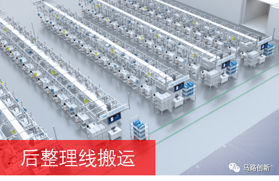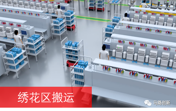 车缝车间的小箱物料配送和验针区域可采用上装滚筒AGV,与输送机对接;