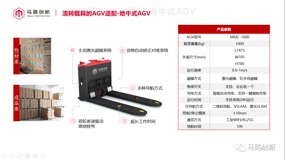 成品搬运和包材库,需要把托盘落地,可采用地牛式AGV等等