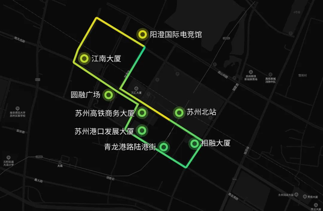 线路沿途设置了8个站点,包括苏州北站、相融大厦、青龙港路陆港街、苏州港口发展大厦、苏州高铁商务大厦、圆融广场、江南大厦和阳澄国际电竞馆,串联起苏州高铁新城的核心交通枢纽、商业办公区、购物中心、居民小区等地。