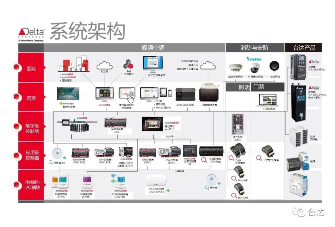 此外,Delta Controls将医院建筑的电梯系统、柴油发电机系统、VRV空调系统、变配电系统、智能照明系统,通过网关集成于楼控平台上,实现统一智能化监测与管理,物业管理人员在主控室可对所有设备及系统进行集中管理及节能控制。截至目前,Delta Controls已为超达20个城市的重点医疗项目提供了楼宇自控系统服务。可根据医院科室工艺不同,在满足复杂的医疗工艺要求的同时,营造一个舒适有效的工作及就医空间。结合先进的“云计算”技术,使医疗资源、空间与设备的使用达到最佳使用率,为“智慧医院”提供可靠、智能的数字基础设施。发挥台达在建筑节能领域优势的同时,降低医院的运维成本。