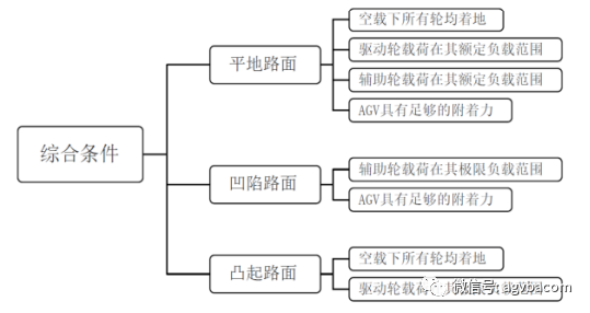 如果保证了AGV在平地中所有轮子共同着地且驱动轮的外凸量大于路面不平度,则AGV处于凹陷路面时所有轮子也必定共同着地,因此,需保证的是各轮的承载其承载范围内、驱动轮的附着力足以防止轮子打滑。
