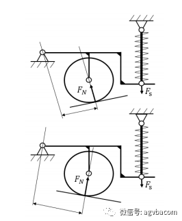 当AGV在坡道中行走时,其坡道方向如图8的上图所示,其驱动轮支承力与摆动铰接点间力臂长度相比另一方向(图8的下图)的要短。在弹簧的压缩量一定时,即弹簧反力一定下,图8上图的驱动轮支承力更大,在AGV负载较大时,应当注意验算驱动轮载荷是否处于额定范围内。