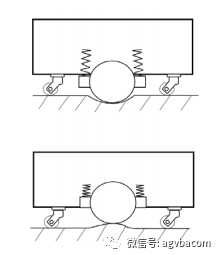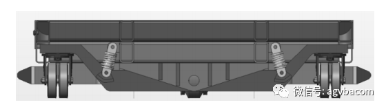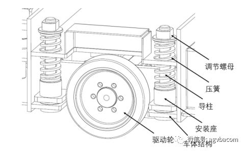 (1)轮系共同着地。在AGV具有多轮的布局轮系中,为保证驱动轮着地,一般的想法是将驱动单元安装得比其他辅助轮凸出来以保证驱动轮的首先着地。但如此一来。辅助轮实际并没有与地面贴紧,导致更多的载荷施加到驱动单元上,降低了AGV的承载能力的同时,AGV的行驶稳定性也会降低。