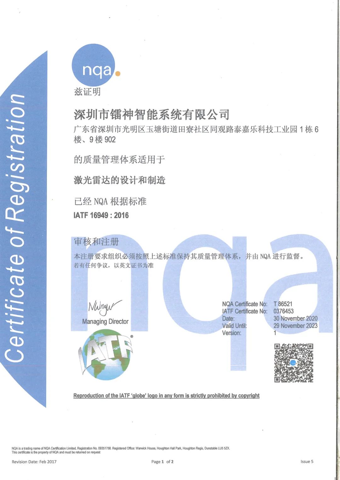 为进一步开拓市场、提升高品质要求和质量管理能力,镭神智能在原来ISO9001质量体系的基础上,进一步推行IATF16949的质量管理体系要求,从体制上为客户提供更完备、可靠的质量保证。