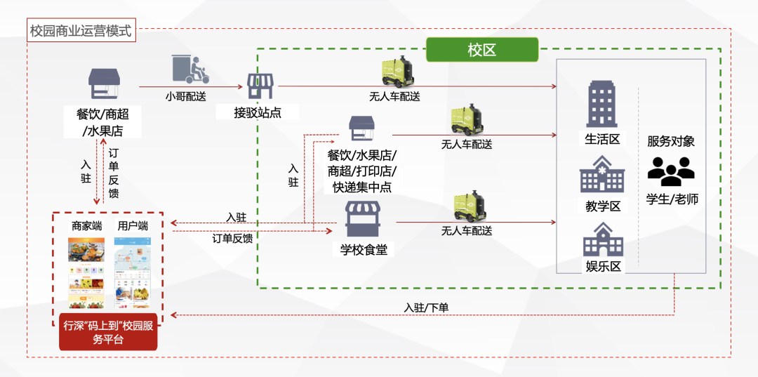 行深智能凭借无人驾驶技术的领先优势以及在校园场景的丰富经验,打造了一整套智慧校园无人车配送及商业服务解决方案。依托具备L4级驾驶能力的系列无人车,通过行深码上到学生服务平台(APP/小程序),打造出线上线下结合、售配一体的校园智能配送服务系统。
