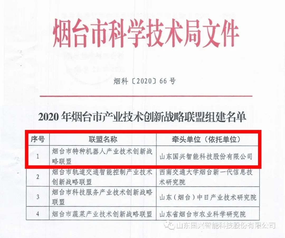 山东国兴智能科技股份有限公司牵头组建“烟台市特种机器人产业技术创新战略联盟”。产业技术创新战略联盟是一种新型的产学研组织,适合用于解决产业和行业面临的技术研发以及成果转化问题。国兴智能今后会承担起牵头单位的责任,围绕国家、山东省、烟台市战略目标和产业转型升级,不断探索完善市场经济条件下联合开发、优势互补、利益共享、风险共担的产学研用长效合作机制,加强技术研发和成果转化,帮助提高特种机器人产业核心竞争力。
