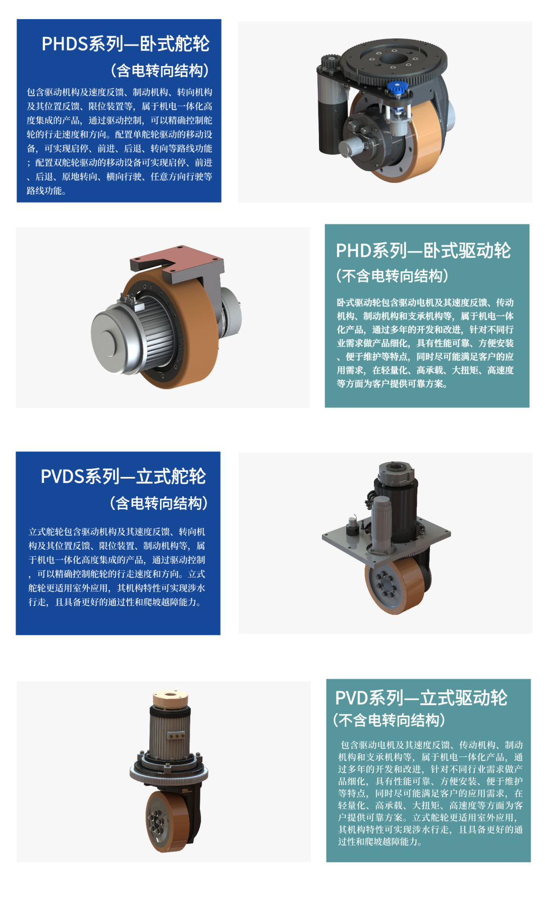 随着近些年,中国物流仓储市场的迅速发展,市场需求趋势也愈来愈现代化、智能化和自动化,所以愈来愈多的AGV机器人也开始投入到具体应用中。像无人分拣机器人、自动驾驶货车和无人叉车等。而驱动轮作为AGV机器人重要的关键核心零部件,直接改变着它们的行走方向及承载力。