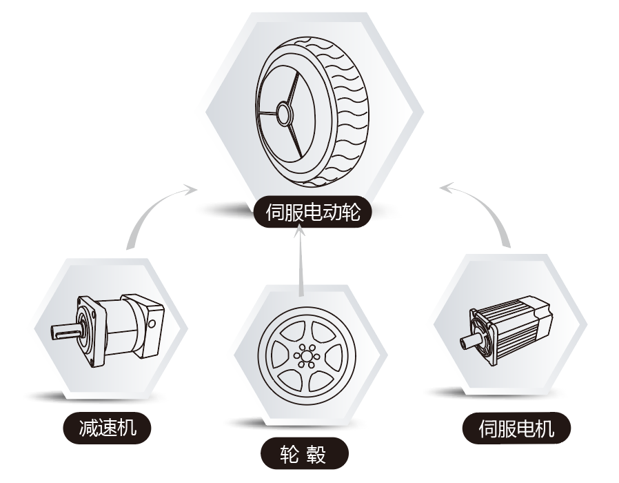 和利时电机公司自主研发的低压伺服电动轮属直驱低压伺服轮毂电机,具备伺服电机高精度、高响应速度等优良特性,三位一体的极简化设计,直接替代原有电机+减速器+轮子的结构,大大提升了机器人底盘空间利用率,降低了机器人本体质量过大的缺陷。