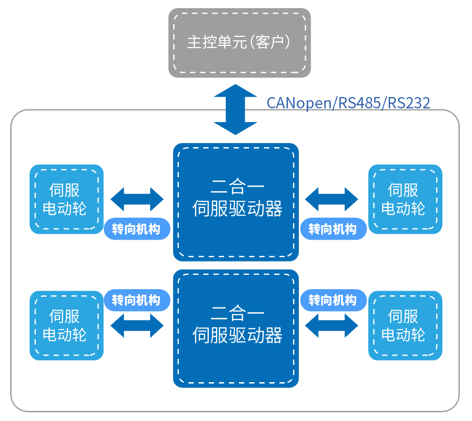 由于低压伺服电动轮具备单个车轮独立驱动的特性,因此无论是前驱、后驱还是四驱形式,它都可以比较轻松地实现。同时,低压伺服电动轮可以通过左右车轮的不同转速甚至反转实现类似履带式车辆的差动转向,大大减小机器人的转变半径,甚至可以实现原地转向。