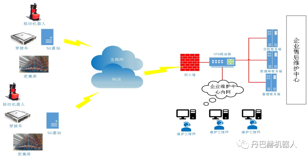 2.利用5G为基础的智慧仓储和移动机器人集群通信链路网络,实现物联网条件下的数据仓库建设,综合利用大数据、机器学习、深度学习等方法,实现远程运维。