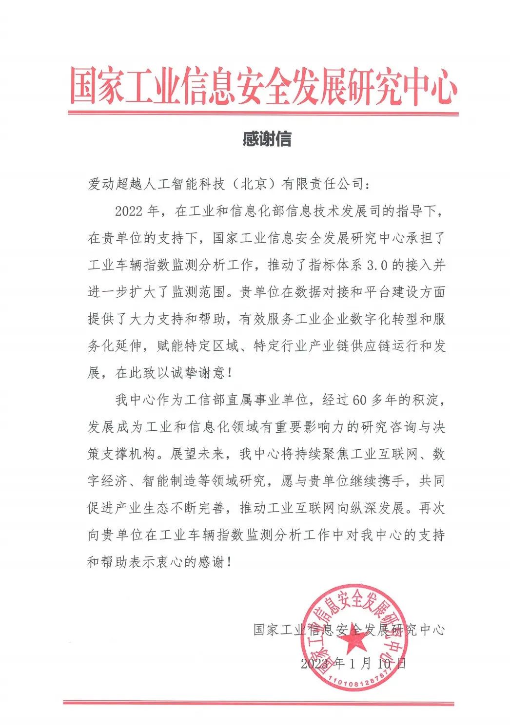 2023年1月,国家工业信息安全发展研究中心向爱动超越发来感谢信,信中对爱动超越帮助国家工业信息安全发展研究中心承担工业车辆指数监测分析工作表示肯定,并就爱动超越大力支持、积极配合国家工业信息安全发展研究中心的工作表示感谢。