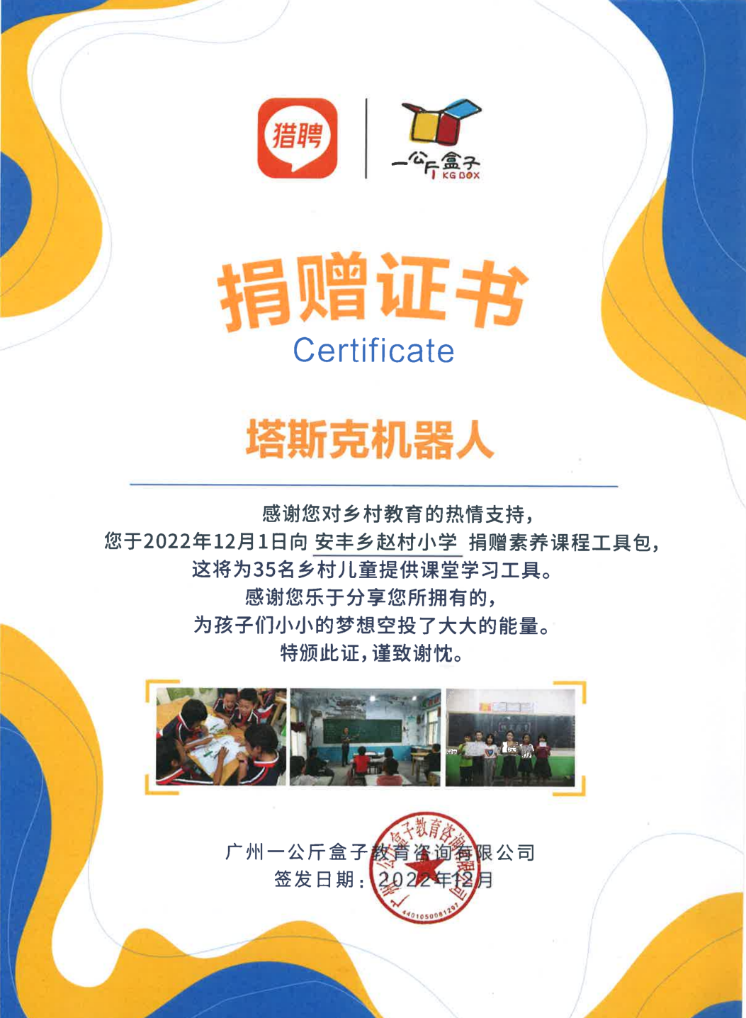 爱心助学子,善举暖人心。为支持乡村教育,塔斯克机器人参与”一公斤盒子“公益组织项目,为安丰乡赵村小学捐赠素养课程工具包。