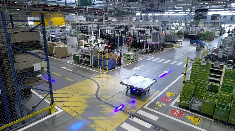 各台机器人均配有特殊的传感器,可以在同一时间安全地穿行行驶路线。在十字路口等特殊的危险区域,机器人还会发出灯光和声音信号,并减慢速度。根据机器人当前的位置和任务负载来动态分配任务。任务队列的管理由 Fleet 软件监督。移动机器人系统自主运行。没有操作员,工作人员唯一的任务就是将装有工件的容器或托盘运送到指定位置。在执行任务的间隙,机器人会自动给自己的电池充电。
