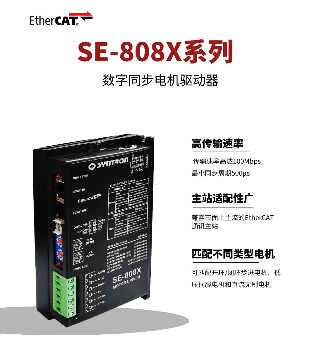 SE-808X系列是北京和利时电机公司在二十多年步进驱动器的研发基础上,融合EtherCAT总线技术打造的高速总线型数字同步电机驱动产品。它支持COE(CANopen over EtherCAT)协议,符合CiA402标准,总线传输速率可达100Mb/s,可实现步进/伺服系统/直流无刷系统的实时控制与实时数据传输,具有高性能、高传输速率、高可靠性通讯等优点。
