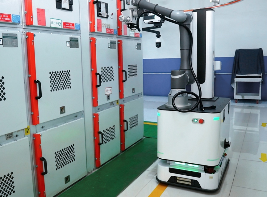 优艾智合的带电操作机器人在执行高低压配电室的智能巡及配电柜自主带电操作任务,完成手车、旋钮、按钮、局放等带电操作的无人化自主操作。