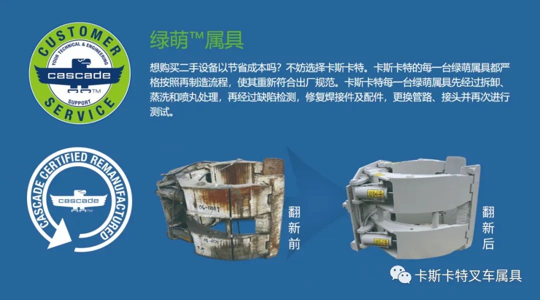世界地球日(The World Earth Day),即每年的4月22日,是一个专门为世界环境保护而设立的节日,旨在提高民众对于现有环境问题的认识,并动员民众参与到环保运动中,通过绿色低碳生活,改善地球的整体环境。自1970年世界地球日首次发起以来,全人类越来越关注自身生存环境,节约地球资源,崇尚绿色环保越来越成为人们的自觉行动。我们都知道,每天都有大量的设备物资,由于各种原因被弃用,尽管它们仍不同程度具有价值。卡斯卡特发现,使那些废弃的卡斯卡特属具重新焕发生命,从而节约资源,即可为保护地球做出自己应有的贡献,这就是卡斯卡特在全球范围推广叉车属具再制造项目的由来。2010年,卡斯卡特在中国率先开展叉车属具再制造项目,包括旧属具的回购、翻新和销售“绿萌”系列叉车属具。卡斯卡特“绿萌”系列叉车属具,是将回收的旧属具经过严格的再生产流程,变成可以重新使用的,符合卡斯卡特同类产品各项性能指标要求的系列产品,满足用户以更小代价获得优质、可靠的叉车属具的愿望。2023年4月,卡斯卡特将以更大的回馈向中国用户推荐再制造项目,呼吁更多地关注资源的再利用。无论是叉车属具还是整机配件,无论是由于时间年限还是故障原因而无法正常使用,只要是卡斯卡特产品,您可以随时联系卡斯卡特服务热线,或者您就近的卡斯卡特服务工程师,我们将上门,或者远程对产品进行评估,为您提供“以旧换新”等多种价值倍增方案,使您购买的卡斯卡特产品更超值,废、旧产品得以焕然一新,倍增服务周期。