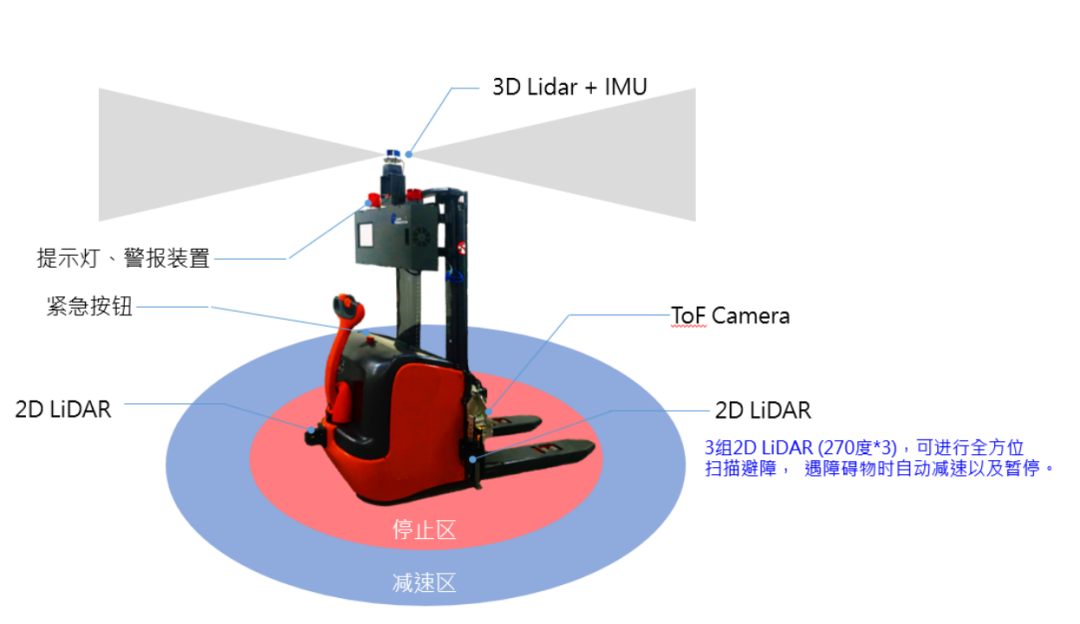 使用3D激光Lidar 进行3D扫描点云,3D立体空间模型精准度更高,可适用于不同环境的场景;AMR智能叉车在空旷长廊场景可依靠3D Lidar+IMU,不需要人为标识或者明显参考物即可精准运行;