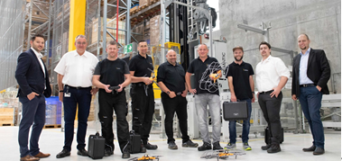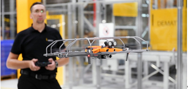 正是由于同事们——Bernd Kurz、Patrick Karg 和 Sven Hagner——的个人热情推动了事情的发展。“我们第一次在仓库里试飞无人机。因为无人机配备了摄像机,Bernd、Patrick 和 Sven 把拍摄的视频发给了我。”Kronfeld 说。就这样,他们开始意识到可能有所发现。在查看这些视频时,Kronfeld 注意到无人机在内部物流方面的巨大潜力。不久之后,德马泰克的客户 Mammut(一家体育用品制造商)安排了首次试点部署。德马泰克的员工被允许进入仓库进行测试,并进一步探索可能的极限,同时最大限度地关注实际应用。“整个过程非常令人兴奋。”