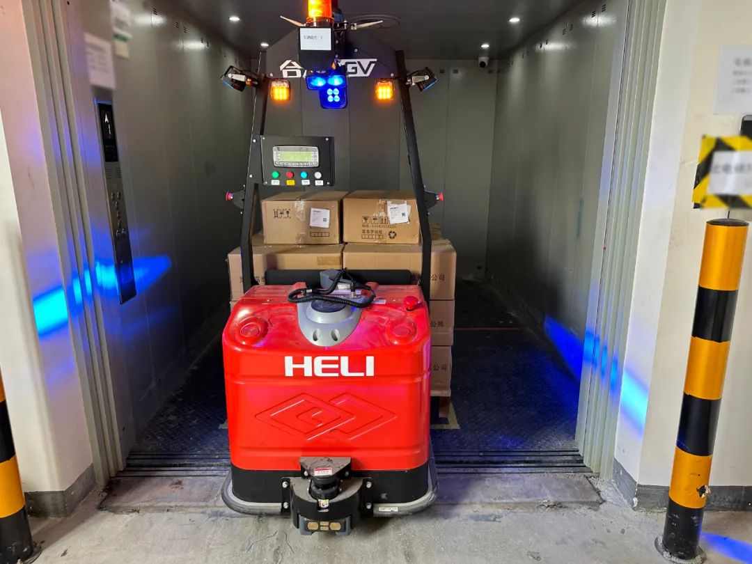 一楼CBD20搬运式AGV响应任务,将接驳位的待入库货物搬运至一楼电梯口,通过ACS系统对接电梯,生成开门任务,电梯开门完全后反馈信号,AGV接受信号将入库物料搬运至电梯内。