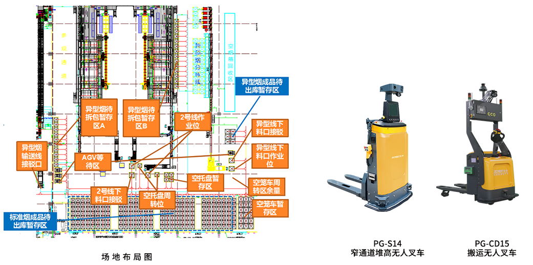 窄通道堆高无人叉车PG-S14、搬运无人叉车PG-CD15作为项目的核心利器,为企业的自动化搬运注入了革命性的力量。