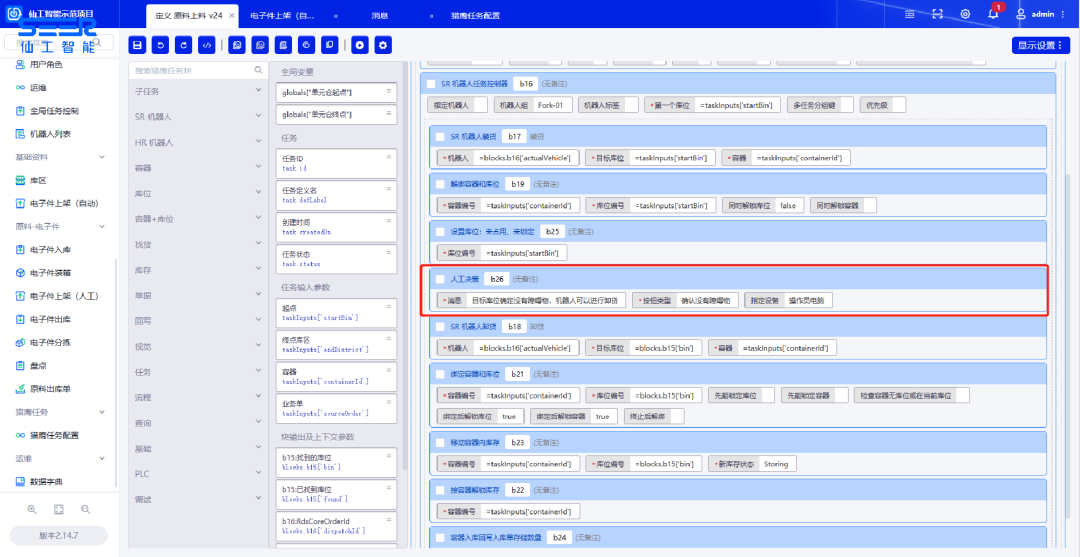 新版 MWMS 中支持直接配置全局控制,不需要编程,支持多种变量类型,如文本、开关、选择,可实现一键切换存储区域、一键全局切换自动/人工模式等。即使客户现场有多条业务在运行,对应多个猎鹰任务,也可以实现全局协同控制。