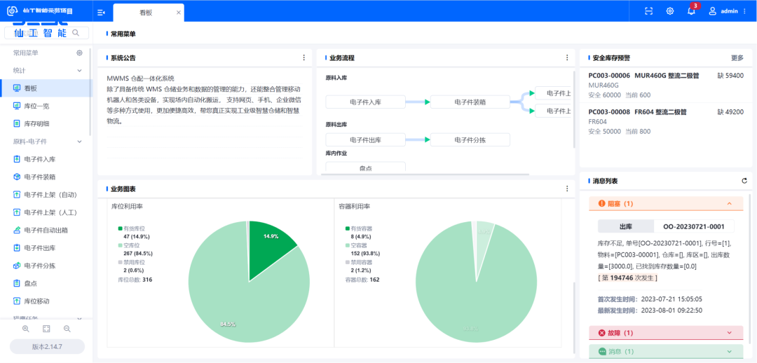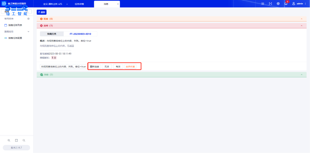 当猎鹰任务发现入库库区满、出库库存不足、没有可用空容器等阻塞性问题,会将问题推送至界面,用户可以第一时间了解并处理,让系统运行透明化,防止问题迟迟得不到解决,阻塞整体业务流程。