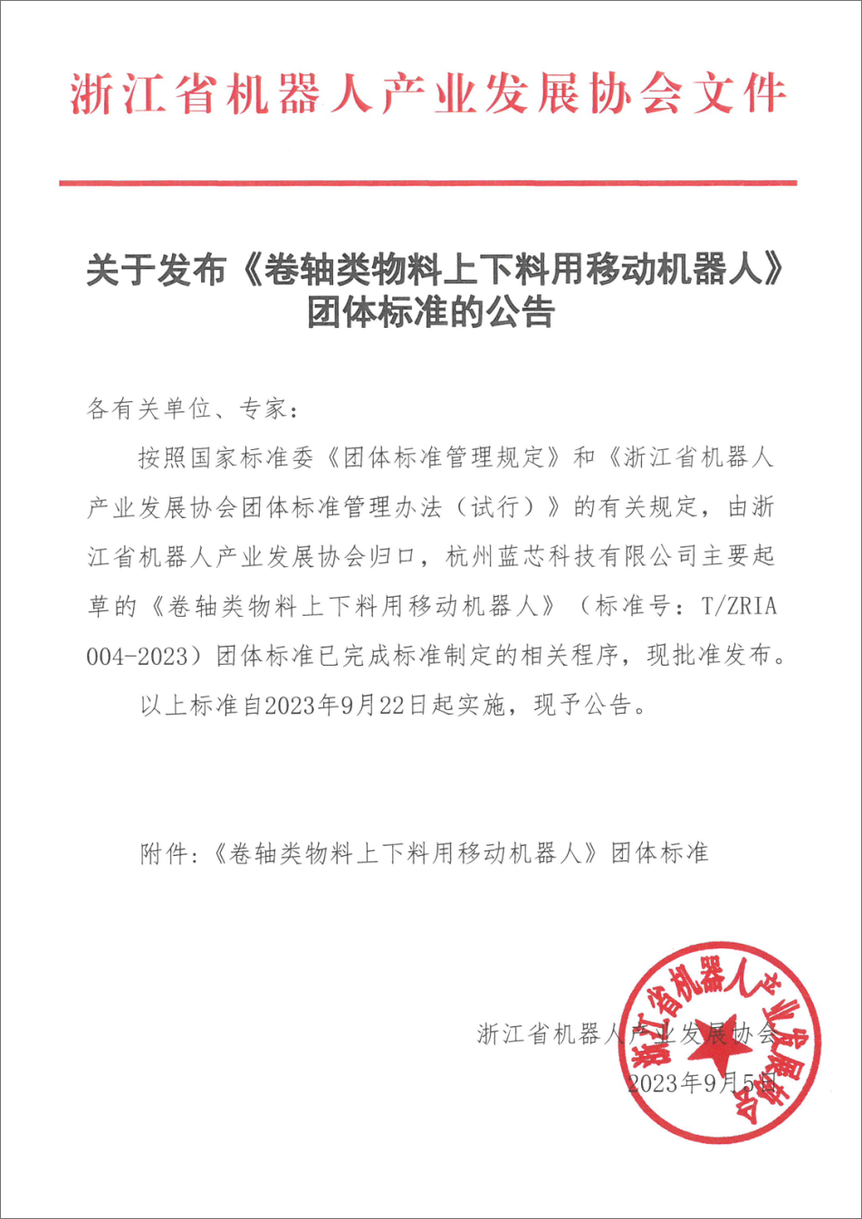 由杭州蓝芯科技有限公司主要起草的《卷轴类物料上下料用移动机器人》(标准号: T/ZRIA004-2023)团体标准已完成标准制定的相关程序,现批准发布。该标准自2023年9月22日起实施。