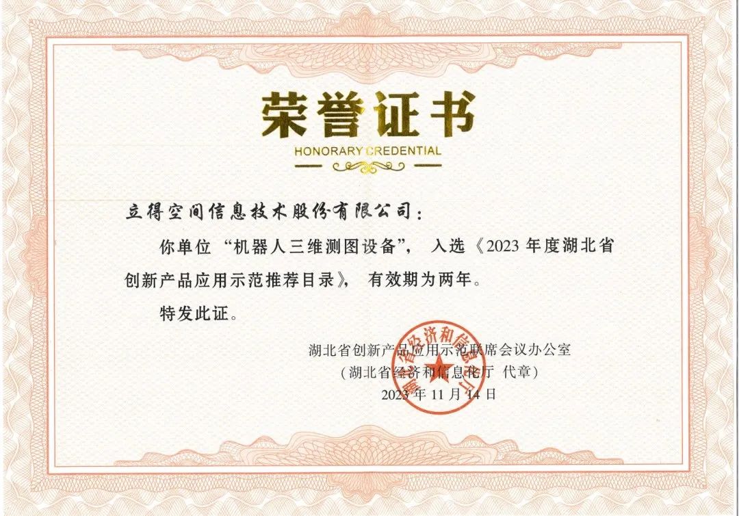 喜讯!立得空间机器人三维测图设备入选湖北省创新产品应用示范推荐目录