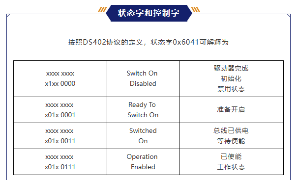 那么用于更改驱动器状态的控制字0x6040,就需要根据当前状态字的内容,进行分步设置。