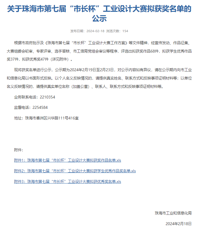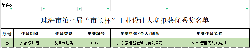 2024年2月18日,珠海市工业和信息化局发布一则关于《珠海市第七届“市长杯”工业设计大赛拟获奖名单的公示》通告,根据市政府批示及《珠海市第七届“市长杯”工业设计大赛工作方案》等文件精神,经宣传发动、作品征集大赛组委会初审、专家评审、选手答辩、市工信局党组会审议等程序,评选出拟获奖作品68件,拟获学生优秀作品奖37件,拟获优秀奖47件(详见附件),泰坦智能“AGV 智能无线充电机”产品成功入选,这是对泰坦智能技术创新和产品品质的充分认可,更是对泰坦公司整体实力的认同。