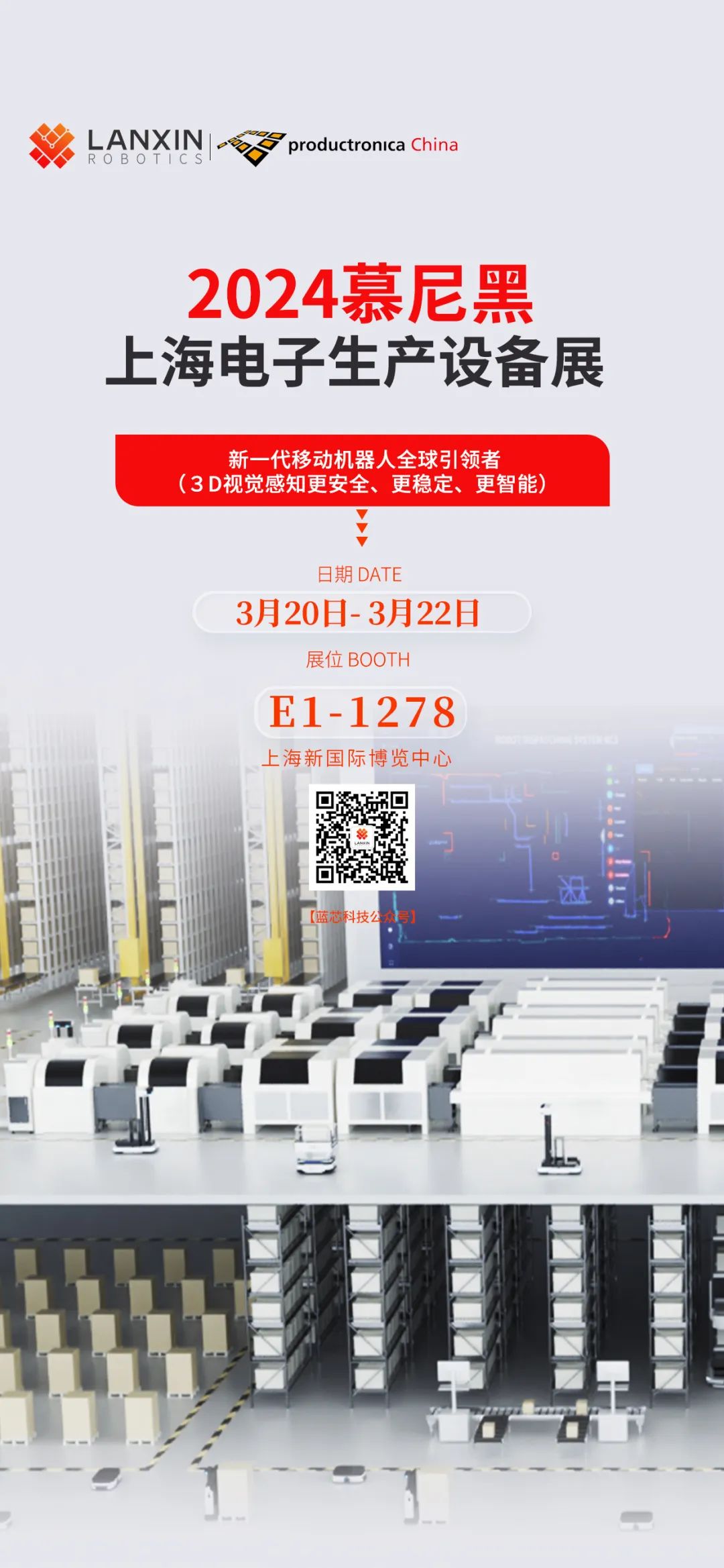 本次展会,蓝芯科技将携SMT上下料机器人 、潜伏式搬运机器人、无人叉车,以及3C工厂智能物流解决方案亮相。诚邀产业链上下游伙伴莅临2024慕尼黑上海电子生产设备展蓝芯科技展台,洞悉生产技术风向,感受智造发展脉动。