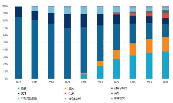 来自Interact Analysis的报告预测,AMR多种机器人混合调度市场预计2021年至2027年间的复合年均增长率为138%。如图1所示,多种机器人协作在各个行业都有广泛应用,目前耐用品制造行业占主要部分。可见混合调度市场发展增速之快,范围之广。