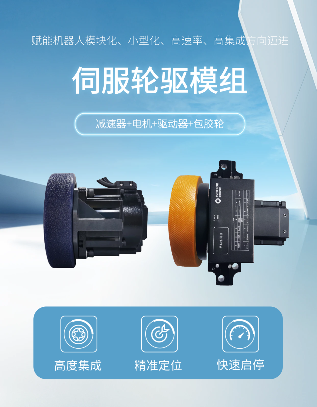 伺服轮驱模组是由轮边减速器、电机、驱动器及包胶轮高度集成,四位一体集成化的设计结构更为紧凑,减少了零部件之间的外部连接线束,解放了设备空间,利于整车布置。伺服轮驱模组各模块可灵活定制,根据不同用户的实际需求,电机功率以及减速比可以灵活调整,为客户提供了高度集成、易维护、性价比高的运动控制解决方案。