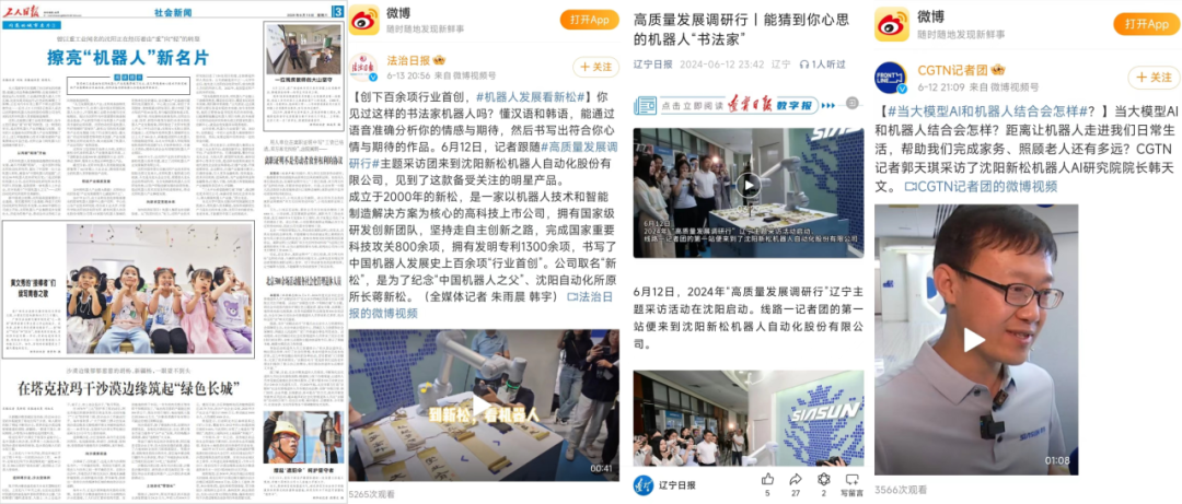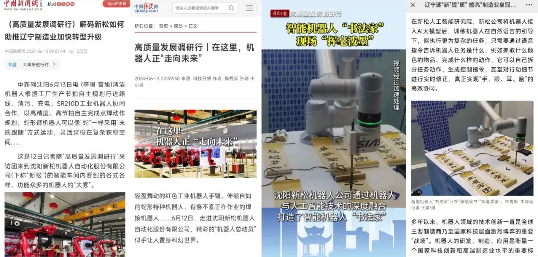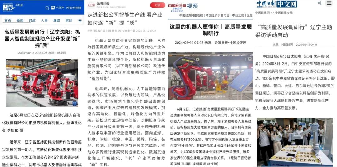 本次调研行,人民日报、新华社、中央广播电视总台、光明日报、经济日报、中国日报、中新社、科技日报、工人日报、中国青年报等中央媒体以及省内多家媒体深度走访新松。人民日报客户端刊发《高质量发展调研行|赋能4000余家企业,新松机器人“大有可为”》、中央广播电视总台新闻直播间《高质量发展调研行 辽宁 探秘机器人赋能千行百业的“新质”密码》权威播出、中新社刊发《(高质量发展调研行)解码新松如何助推辽宁制造业加快转型升级》、科技日报刊发《高质量发展调研行丨机器人产业跑出“加速度”》、《高质量发展调研行丨在这里,机器人正“走向未来”》等涉及新松的精品力作30余篇,各门户网站以及行业媒体纷纷相继转发,上百篇次全媒体报道,引发广泛关注。